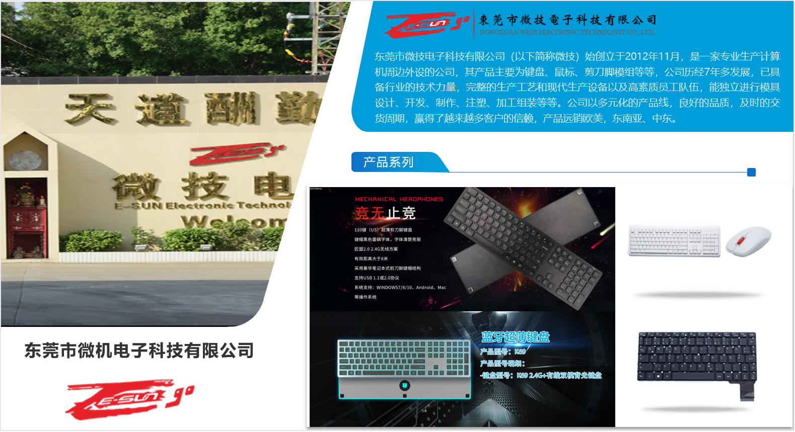 东莞市微技电子科技有限公司(以下简称微技)始创立于2012年11月,是一家专业生产计算机周边外设的公司,其产品主要为键盘、鼠标、剪刀脚模组等等,公司历经7年多发展,已具备行业的技术力量,完整的生产工艺和现代生产设备以及高素质员工队伍,能独立进行模具设计、开发、制作、注塑、加工组装等等。公司产品款式丰富,兼容高、中、低档次,月生产能力达50至60万只。公司以多元化的产品线,良好的品质,及时的交货周期,赢得了越来越多客户的信赖,产品远销欧美,东南亚、中东。