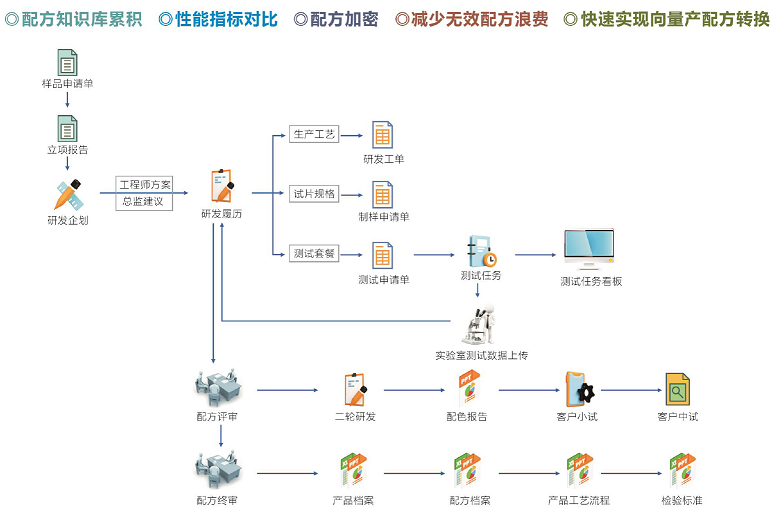 每个工程师只能看到参与的配方,防止数据外泄,配方从方案设计到下达任务,制样小组按工单进行生产样品,记录样品生产工艺、配色过程。