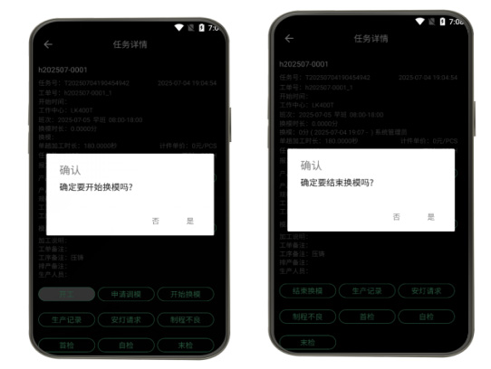 工业级移动终端部署实现全工序数字化闭环:智能开工验证(任务自动校验/工艺参数确认/电子作业指导书调取)与精准报工管理(即时报工/不良品录入/机器计数)的无缝协同