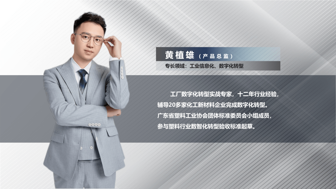 随后,由顺景软件产品总监黄植雄做了“新材料行业数字工厂系统整体解决方案“的主题报告。黄总从新材料行业的产业特性、痛点出发,介绍了顺景的数字化工厂解决方案的核心优势。